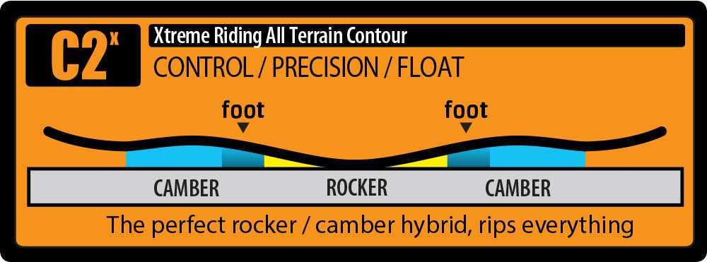 | Прогиб - C2X Camber: | наиболее мощный прогиб из всей линейки бренда. В середине большого кебера лежит микро-рокер (mild rocker). Это очень агрессивная форма для опытных райдеров, которые хотят полного контроля и очень чувствительной доски на высоких скоростях. |