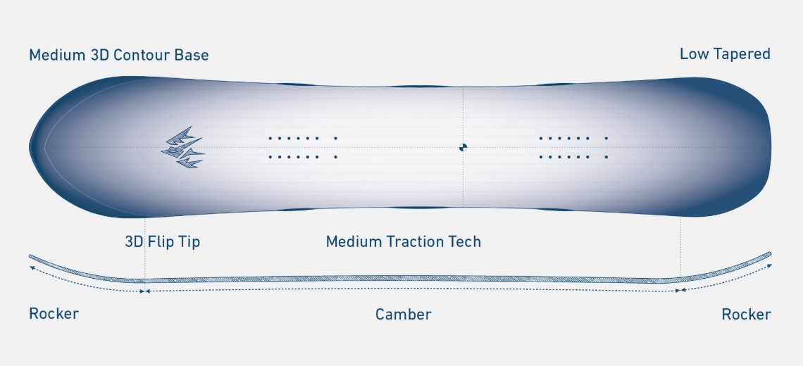 | 3D Contour Base 2.0: | умеренная версия фирменной технологии Jones, так называемой "ложки", когда контактные точки на носу и хвосте приподняты вверх над снегом для большей уверенности вождения. в версии 2.0 "ложка" начинается с места начала рокера; |
