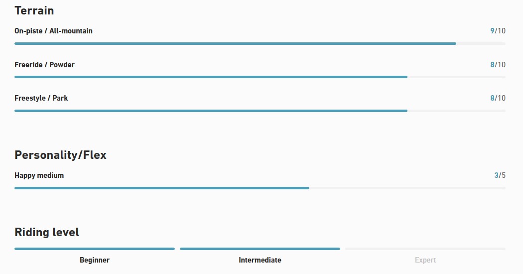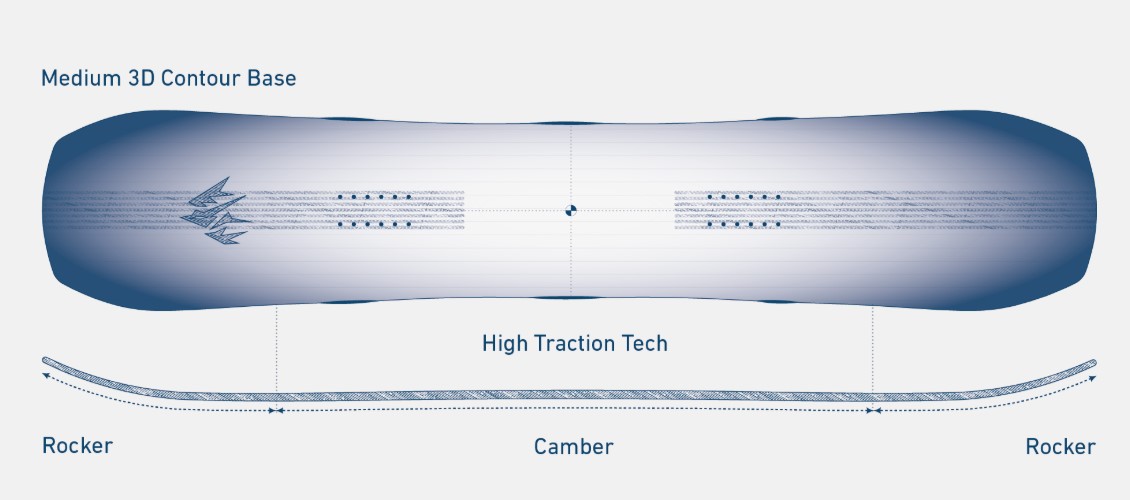 | 3D Contour Base 2.0: | умеренная версия фирменной технологии Jones, так называемой "ложки", когда контактные точки на носу и хвосте приподняты вверх над снегом для большей уверенности вождения. в версии 2.0 "ложка" начинается с места начала рокера; |
