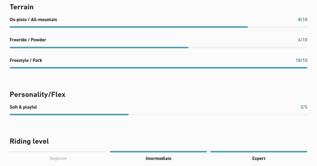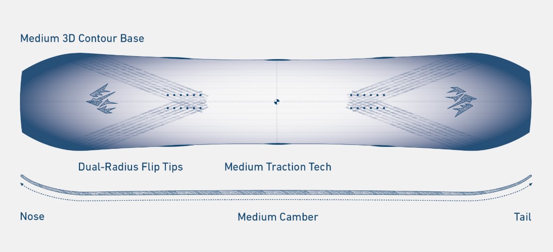 | 3D Contour Base 2.0: | умеренная версия фирменной технологии Jones, так называемой "ложки", когда контактные точки на носу и хвосте приподняты вверх над снегом для большей уверенности вождения. в версии 2.0 "ложка" начинается с места начала рокера; |