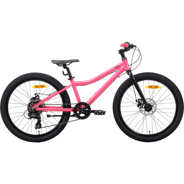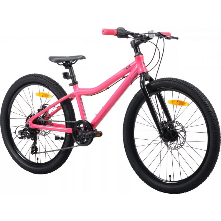 Pride Frida 4.1 2026 - універсальний підлітковий велосипед, який однаково добре підходить для катання містом, парком чи ґрунтовими стежками. Модель розрахована на активних дітей зі зростом 135–155 см і стане відмінним вибором для щоденних поїздок та прогулянок. Легка алюмінієва рама та вилка зменшують вагу велосипеда та підвищують жорсткість конструкції, що робить керування більш чітким і динамічним. Геометрія адаптована на основі дорослих гірських велосипедів, але оптимізована під підлітків. Модель має комфортну посадку, а керування інтуїтивно зрозуміле та зручне навіть під час тривалого катання. Велосипед оснащений 7-швидкісною трансмісією Shimano, яка дозволяє легко долати підйоми та підтримувати комфортну швидкість на рівних ділянках. Механічні дискові гальма забезпечують надійне гальмування за будь-якої погоди, не потребують складного обслуговування та стабільно працюють навіть при неідеальній геометрії колеса. Колеса з подвійними алюмінієвими ободами та універсальними покришками добре тримають дорогу як на асфальті, так і на пухкому ґрунті чи піску. Протектор забезпечує баланс між накатом і зчепленням, додаючи впевненості на різних типах покриття. Легкий хід забезпечують втулки Quando, зменшуючи навантаження під час педалювання. Додатковим плюсом є наявність підніжки, яка спрощує паркування. Pride Frida 4.1 - це практичний, стильний і надійний велосипед, який чудово підійде для активного щоденного катання.