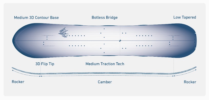 | Геометрія - Directional Rocker: | спрямована форма з класичним прогином між заставними, які переходять у невеликі рокери на носі та хвості. Підходить для фрірайду та швидкісних спусків; |