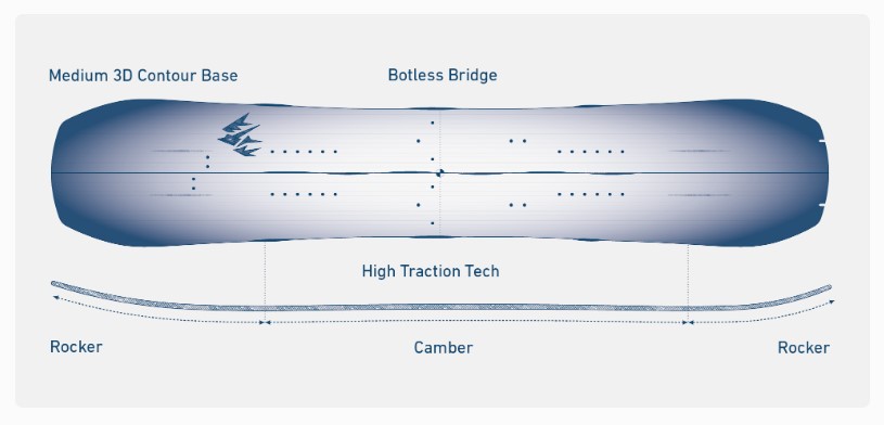 | Прогин - Camber Rocker: | класичний кембер під закладними для стабільності та хорошого попу переходить в стрімкий рокер на носі для найкращої пливучості; |