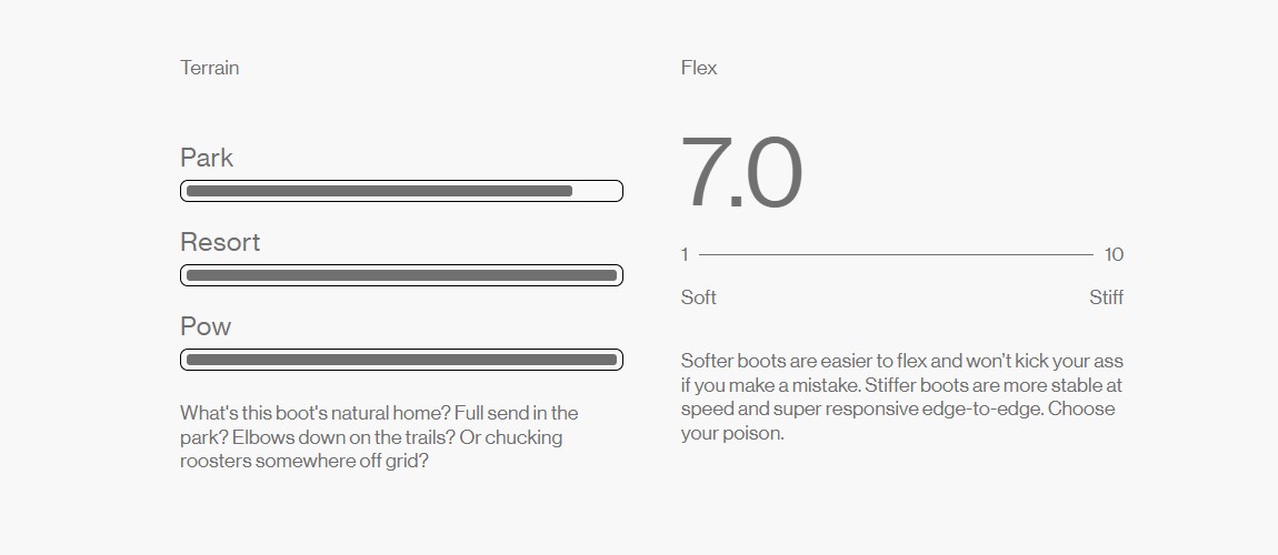 | Future Flex Construction: | це інноваційна технологія, яка дозволяє черевикам для сноубордингу зберігати свою оптимальну гнучкість протягом усього терміну служби. На відміну від традиційних матеріалів, які з часом втрачають свої властивості |