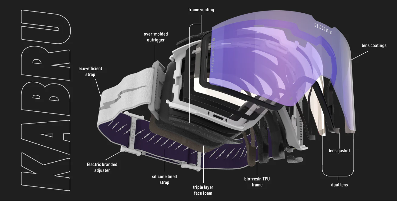 Electric Kabru створена для райдерів, які очікують максимальної стабільності, чіткості та надійності в найскладніших гірських умовах. Kabru поєднує технологічність преміум-класу з ергономічним дизайном, що забезпечує комфорт протягом усього дня. Унікальна система фіксації поєднує магніти, фронтальний brow clip та опорний виступ у зоні переносиці. Це утримує лінзу міцно зафіксованою навіть на високій швидкості, під час різких рухів або падінь. Рамка Dual Density Co-Molded Frame має подвійну щільність матеріалів, що гарантує надзвичайно щільну посадку лінзи в рамці з максимально комфортним приляганням. Продумані фронтальні кріплення ремінця рівномірно розподіляють тиск, забезпечуючи комфорт з шоломом та без. Ключові технології та переваги Electric Kabru: