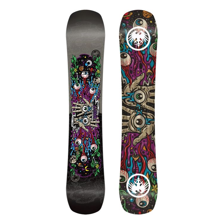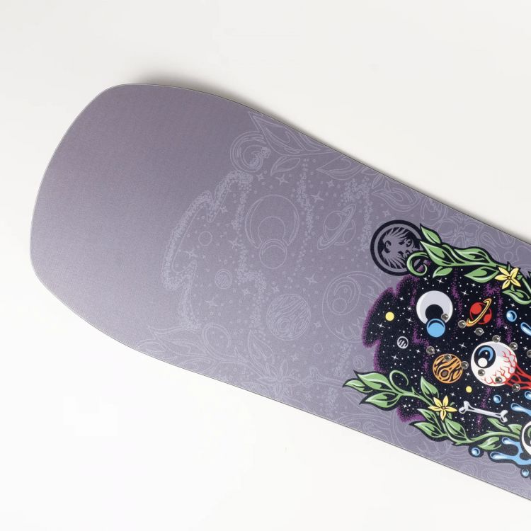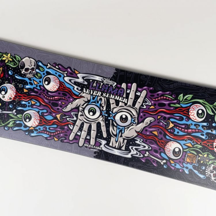 Never Summer Llama 2026 (названий на честь одного з перших райдерів команди Never Summer, Еріка «Лами» Сегріса) з артворком від легендарного Джимбо Філліпса (Jimbo Phillips) - це дошка, створена для фрістайл-катання по всій горі (all-mountain freestyle). Це асиметричний твін із м'якшою, ніж середня, жорсткістю для того, щоб вам було зручно виконувати всі свої фрістайл трюки та прийоми. Завдяки прогину Recurve Triple Camber, Llama забезпечує вибуховиі стрибки (pops) для трюків та плавні, чіткі повороти, надійно утримуючи дошку на канті. В основі прогину лежить великий домінантний кембер, в який втиснули 3 маленьких кем-рока. Якщо вам тяжко уявити як це виглядає - гортайте до низу та подивіться наглядний приклад схеми прогину. Однією важливою відмінністю від інших моделей є асиметричний кант, тобто лівий і правий кант дошки мають різний радіус бокового вирізу, що дозволяє ще більш ефективно прогресувати у фрістайлі. Отже, Never Summer Llama найм'якіша дошка в колекції, яка розроблена для фрістайлу, джибінгу та фанового катання з виконанням флет-трюків.