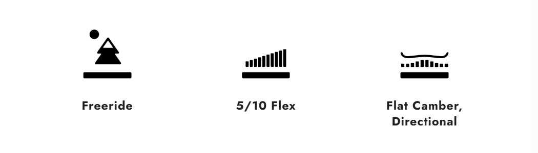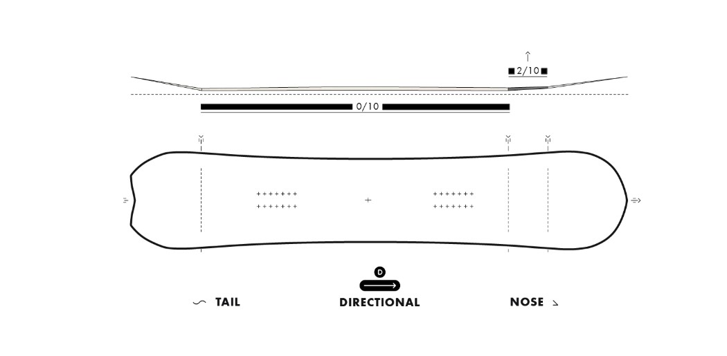| Прогин - FLAT CAMBER: | цей профіль плоский з рокером у носовій частині забезпечує збалансовану їзду, яка не є ні надто агресивною, ні надто вільною. Він пропонує стабільну гнучкість та передбачуване відчуття з ледь помітними рисами традиційного кембера; |
