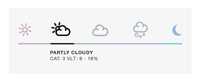 | Полностью солнечно | Частичное облачность | Мрачно | Штормовая погода | Плохое освещение | Фотохромные линзы |