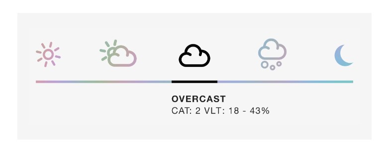 | Полностью солнечно | Частичное облачность | Мрачно | Штормовая погода | Плохое освещение | Фотохромные линзы |