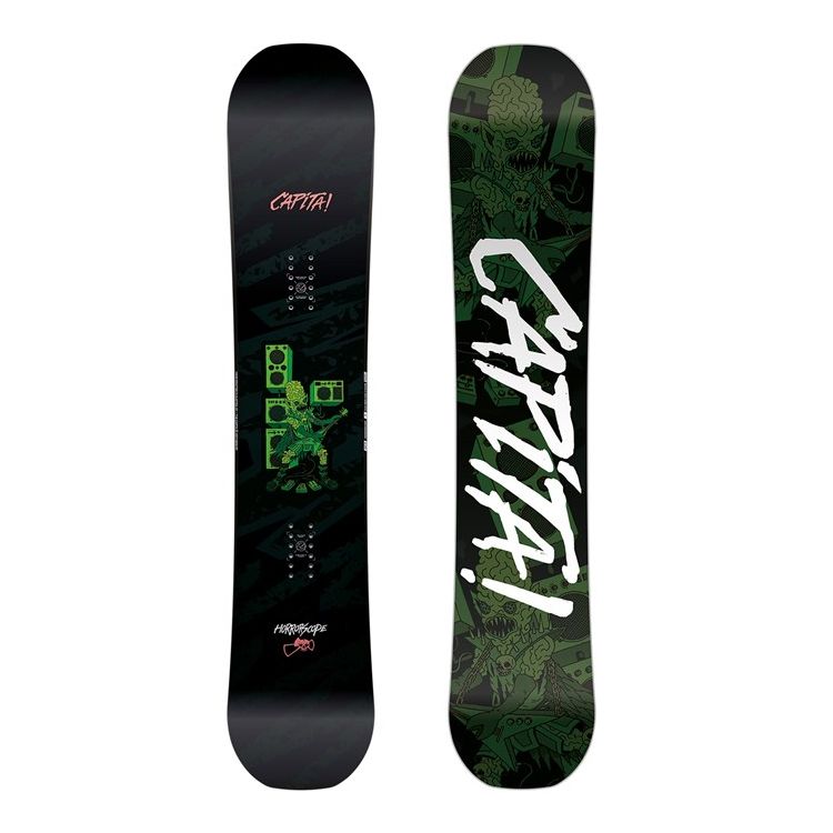 CAPITA Horrorscope 2021 - это бестселлер, то есть самый продаваемый сноуборд в коллекции несколько сезонов подряд, особенно в 2013-2015, когда мода на рокерные манёвренные доски была на пике. Одним из ключевым фактором такой популярности является ценовая политика, ведь при очень солидных характеристиках, это самая бюджетная доска в коллекции. Теперь подробнее о комплектации. Ключевым моментом для управляемости и манёвренности служить прогиб PARK V2 PROFILE (плоская часть между закладными плавно переходит в рокеры к хвостам. Самый фановый прогиб: флетовая часть даёт стабильность, а рокерные зоны позволяют всплывать в пухлом снегу и прощают ошибочные движения райдера) и невысокая жесткость всей конструкции (по шкале Капиты это 4/10). Даже в начальной модели Капиты вы имеете комбинированный сердечник из бука и тополя. Он лёгкий и прочный, обеспечивает хорошую отзывчивость, высокий щелчок, мощную производительность и долговечность. В доске используется спеченная база, которая отлично скользит по любой поверхности, в то время как у конкурентов такие скользяки используются только на топовых моделях. В глазах команды - хоррорскоуп это фристайловая и джибовая досочка, мягкая и податливая, на которой можно прыгать и скользить по чём угодно. Но, даже купив CAPITA Horrorscope 2021 как одну и основную доску, вы отлично будете справляться с различными кондициями снега и погодными условиями: от парковых заездов - до паудер деньков.