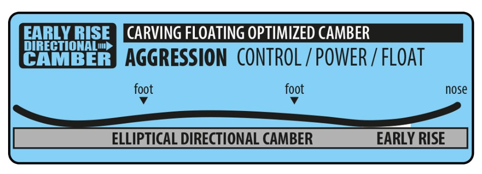 | Прогиб - Early Rise Directional Camber: | фанки версия классического кембера. Хвост и особенно нос поднят раньше, что делает доску легче в управлении на низких скоростях и для езды по пухлому снегу. |