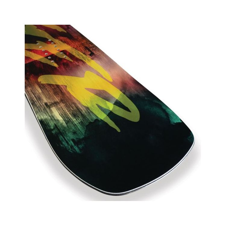 | Геометрия: Assymetric True Twin | фристайловый прогиб, который позволяет кататься в обеих стойках. Расстояние до закладных со стороны носа и хвоста одинаковое, но доска имеет различные радиусы бокового выреза (toe and heel side), таким образом помогая закручиваться ещё легче. |