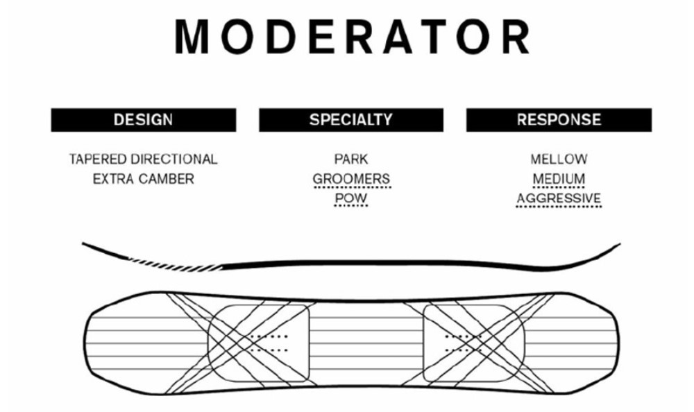 Ride Moderator 2026 - это универсальная унисекс all-mountain модель “одна доска на все случаи”, созданная для райдеров, желающих стабильного контроля, чистых дуг и уверенного поведения в любых условиях. Средняя, сбалансированная жесткость делает эту доску комфортной и предсказуемой, а Tapered Directional Extra Camber обеспечивает точный контроль канта, хороший отрыв и надежность на скорости. Легкое поднятие носа придает плавучесть в пухлом снегу, но без потери универсальности на подготовленных трассах. Moderator все равно хорошо ведет себя на жестком покрытии, в глубоком снегу и в смешанном рельефе - просто ставь крепления и катай где угодно. Moderator – это премиальный all-mountain борд, созданный, чтобы комфортно и точно управлять в любых условиях: от жесткого утреннего вельвета до свежего пухляка. Он не нуждается в компромиссах и всегда готов к новым линиям на всей горе.