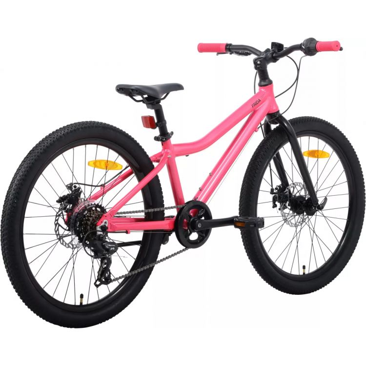 Pride Frida 4.1 2026 - універсальний підлітковий велосипед, який однаково добре підходить для катання містом, парком чи ґрунтовими стежками. Модель розрахована на активних дітей зі зростом 135–155 см і стане відмінним вибором для щоденних поїздок та прогулянок. Легка алюмінієва рама та вилка зменшують вагу велосипеда та підвищують жорсткість конструкції, що робить керування більш чітким і динамічним. Геометрія адаптована на основі дорослих гірських велосипедів, але оптимізована під підлітків. Модель має комфортну посадку, а керування інтуїтивно зрозуміле та зручне навіть під час тривалого катання. Велосипед оснащений 7-швидкісною трансмісією Shimano, яка дозволяє легко долати підйоми та підтримувати комфортну швидкість на рівних ділянках. Механічні дискові гальма забезпечують надійне гальмування за будь-якої погоди, не потребують складного обслуговування та стабільно працюють навіть при неідеальній геометрії колеса. Колеса з подвійними алюмінієвими ободами та універсальними покришками добре тримають дорогу як на асфальті, так і на пухкому ґрунті чи піску. Протектор забезпечує баланс між накатом і зчепленням, додаючи впевненості на різних типах покриття. Легкий хід забезпечують втулки Quando, зменшуючи навантаження під час педалювання. Додатковим плюсом є наявність підніжки, яка спрощує паркування. Pride Frida 4.1 - це практичний, стильний і надійний велосипед, який чудово підійде для активного щоденного катання.
