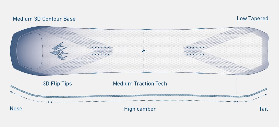 | 3D Contour Base 2.0: | помірна версія фірмової технології Jones, так званої "ложки", коли контактні точки на носі та хвості припідняті вгору над снігом для більшої впевненості керування. у Версії 2.0 "ложка" починається з місця початку рокера; |