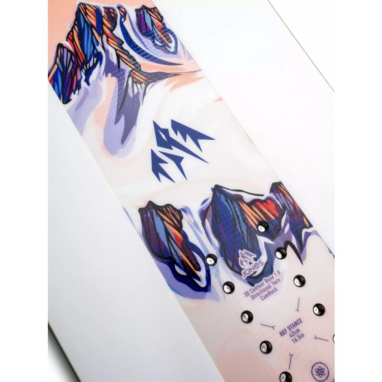 | 3D Contour Base 2.0: | помірна версія фірмової технології Jones, так званої "ложки", коли контактні точки на носі та хвості припідняті вгору над снігом для більшої впевненості керування. у Версії 2.0 "ложка" починається з місця початку рокера; |