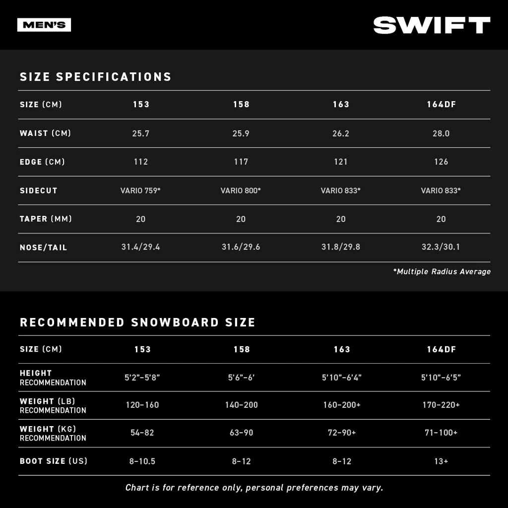 Never Summer Swift - культовий паудерний сноуборд, який став відправною точкою для серії Shaper Series від Тіма Канадея. Ця модель здобула віддану аудиторію завдяки унікальному поєднанню форми та поведінки, яке виходить далеко за межі класичних уявлень про дошки для глибокого снігу. Swift створений так, щоб дарувати впевненість і контроль у будь-яких умовах, а не лише в пухляку. Його характерна форма забезпечує неймовірний флоут у глибокому снігу, дозволяючи кататися з мінімальними зусиллями навіть на довгих спусках. При цьому дошка залишається стабільною й чіткою на трасі та в змінному снігу, що робить її значно універсальнішою, ніж більшість класичних паудерних моделей. Продумана геометрія допомагає легко входити в повороти, тримати лінію на швидкості та зберігати контроль у складному рельєфі. Swift однаково добре почувається на відкритих схилах, у лісі та на крутих ділянках, де важливі точність і передбачувана реакція. Саме ця здатність «робити все» і стала причиною культового статусу моделі серед райдерів. Never Summer Swift 2026 - це вибір для тих, хто шукає паудерну дошку з реальною універсальністю: максимум задоволення у глибокому снігу без обмежень у повсякденному катанні по всьому курорту.